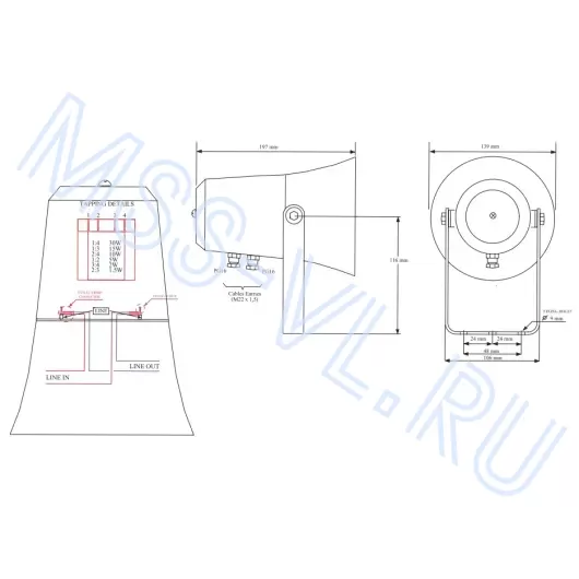 The IMCOS-6811 loudspeaker is a waterproof horn loudspeaker for public address systems. It features six power levels. It is constructed of impact-resistant ABS plastic with 316L stainless steel screws, ensuring complete corrosion protection and excellent moisture resistance (IP66).